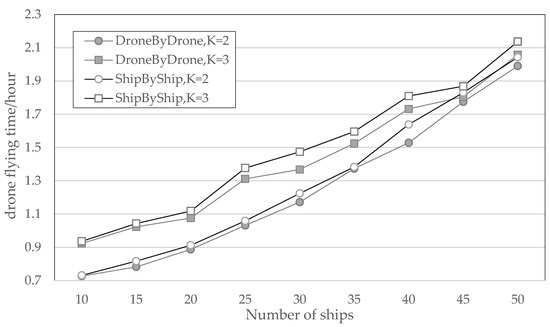 The impacts of dataset sizes on the division strategies are investigated in Figure 7. The solution methods, and are executed for the datasets with different numbers of drones () and ships (), and . With the same number of ships to be detected, the total time for detecting ship pollutants is significantly shorter when using three drones compared to that when using two drones. However, under the same drone quantity condition, adopting the strategy results in shorter drone flight times than when using the ShipByShip strategy. As described in Section 5.3.3, the strategy prioritizes scheduling drone visits to ships based on the number of ships a drone can access, resulting in a sequence of nearby visits. In contrast, the strategy assigns each ship to a corresponding drone. Compared with the strategy, the ShipByShip strategy may require the detection of ships that are further apart from each other, and as ships and drones move synchronously, the flight time during the drone’s visit to a ship increases when the ship being visited is farther away.