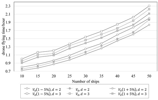 Sensitivity of the ships’ speeds () and drones’ speeds ().
