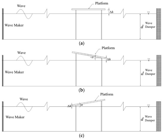 The influence of the geometries of the platform deck, that is, inclination angles α and the height Δh, can also be observed according to the comparison between the subfigures in Figure 5. The impact loading on the deck decreases with the increase in inclination angle, that is, the α range from −4° to 4°. It can be explained that the deck bottom is directly exposed to the incident wave when the inclination angle is α = −4°; meanwhile, it is the opposite case when the inclination angle is α = 4°. The increased deck height, that is, following the sequence of Δh = 0, 0.02 and 0.04 m, can also decrease the impact loading on the platform. The increased deck height is able to make the platform far away from the incident wave, leading to the decrease in impact loading.