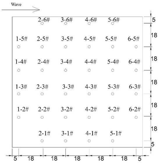 The platform is located in the center of the wave basin, which is made of wood and trusses. The platform deck is 1.0 m in length and 1.0 m wide, with a 0.1 m thickness. Five deck angles, that is, α = −4°, −2°, 0°, 2°, and 4°, are selected, as shown in Figure 1. In total, 32 probes are adopted for measuring the impact pressure of the platform deck, where the sampling frequency is 50 Hz. The distribution of pressure probes is shown in Figure 2.