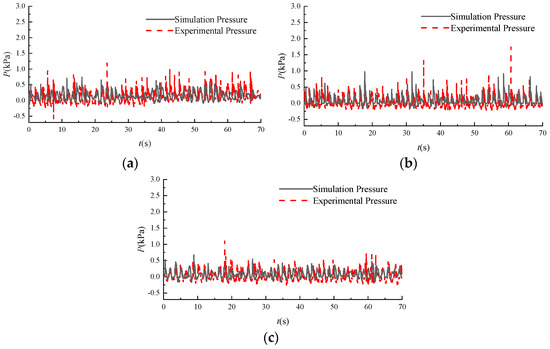 As shown in Figure 4, further validations are conducted by the comparison of irregular wave actions, where the incident wave conditions are Tp = 1.70 s and Hs = 0.08 m. The geometry of the platform deck is still Δh = 0 m with inclination angles α = −4°, −2°, and 0°. Compared with the accuracy of regular wave actions in Figure 3, the discrepancy between the numerical and experimental results is a little increased. This is mainly due to the random characteristics of irregular waves. Generally speaking, acceptable accuracy can be obtained by using the present viscous fluid flow model. According to the comparisons, it can be confirmed that the present numerical wave flume can work well in predicting the behavior of impact loading on the platform deck under regular and irregular wave actions.