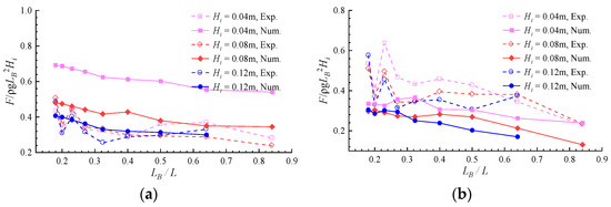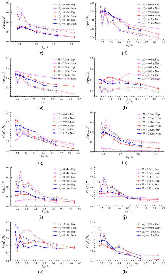 Both laboratory tests and numerical simulations are carried out for measuring impact loading on the platform deck under regular waves. Note that the impact forces of the experimental measurement are obtained by the pressure probes multiplied by the corresponding area; meanwhile, the impact forces of the numerical model are calculated according to the integral and the body surface. This is also the major reason for the discrepancy between the experimental and numerical results. Figure 5 shows the variation in the impact loading forces with the relative length of platform LB/L, where LB and L are the platform length and wave length, respectively. Again, good agreement between the experimental and numerical results can be observed, implying acceptable accuracy of the present simulating method. When the relative length of the platform LB/L is larger than 0.4, the impact loading forces show a decreased tendency with the relative platform length LB/L. It can be understood that the long wave has more energy and generates increased impact loading on a small relative platform length LB/L. In the region of LB/L = 0.2–0.4, the variation in the impact loading forces has different behavior patterns at different inclination angles α, different heights of the platform deck Δh, and different incident wave heights Hi.