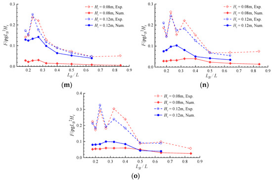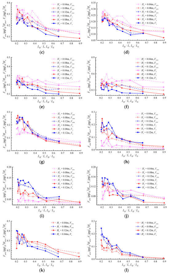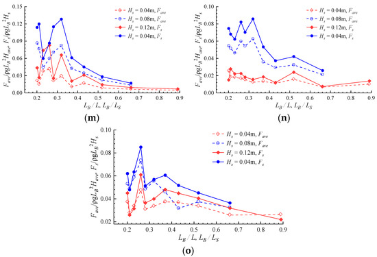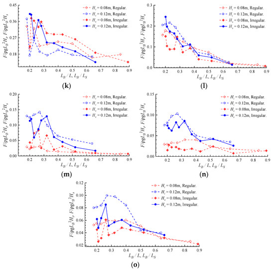 Furthermore, the results of the impact loading forces under irregular wave actions between different statistical samplings are compared in Figure 7. Note that the normalized amplitudes are illustrated in this figures, where the normalization is conducted by using the corresponding statistical data, such as Fs/ρgLB2Hs and Fave/ρgLB2Have. In Figure 7a–f, the normalized amplitudes of the impact loading forces computed from the samples with large amplitudes are always smaller than those of the samples with small amplitudes. That is, the values of Fs/ρgLB2Hs are smaller than Fave/ρgLB2Have. It can be understood that larger wave amplitudes may generate more dissipation when the platform deck is submerged in water. In contrast, as shown in Figure 7g–o, the normalized amplitudes of the impact loading forces computed from the samples with large amplitudes are always larger than those of the samples with small amplitudes. This is due to the increased nonlinear effect of impact behavior when the platform deck is above the still water level.