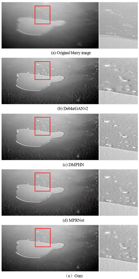To further validate the performance of the UV-image-deblurring network, various deblurring methods were tested on the chemical UV images. Figure 7 shows the comparison results of the different deblurring methods, where Figure 7a is the input of the original blurry UV image, and Figure 7b–e depict the results of applying various deblurring methods to UV images. As shown in Figure 7b, when the DeblurGANv2 method is applied for UV-image deblurring, the image detail recovery is mediocre, with significant blurring issues still existing in the details. The overall image edge has artifacts and ringing phenomena, resulting in poor image quality. Figure 7c,d present the results of using the DMPN and MPRNet methods, which are currently known for their excellent recovery effects on RGB images. It can be seen that when these two methods are applied for the deblurring of blurry UV images, the deblurring results in a significant improvement in the details compared to the DeblurGANv2 method, with clearer detail information. However, just like with the DeblurGAN method, the edges of the entire image still have severe artifacts and ringing phenomena, making the deblurring results unsatisfactory. Figure 7e displays the recovery effect of the deblurring method proposed for UV images in this chapter. It can be observed that, compared to the previous methods, the detail information of the image was better restored and preserved after deblurring. Furthermore, there are no prominent artifacts and ringing phenomena at the image edge. The overall image is smoother, which leads to better deblurring results.