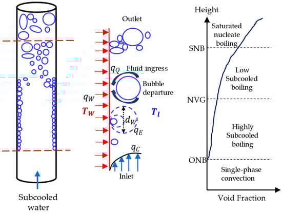 The wall boiling model, founded on the experimental results of Kurul and Podowski [28], represents a nucleate boiling framework. Figure 2 depicts this model, where the heat flux impinging on the wall is segregated into three distinct components as per Equation (9) upon the entry of subcooled liquid into the pipe. This segregating aids in detailing the bubbles formation process.