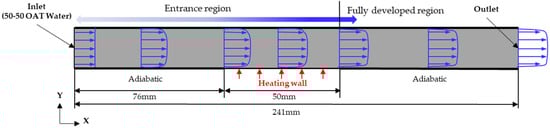 The conditions and setup for the multiphase thermal flow simulation were set as shown in Figure 4, with a two-dimensional simulation chosen to minimize computational time. Additionally, the anticipated velocity profile within the channel was illustrated. While the experiments involved wall temperature by applying heat flux to a heating block, this simulation streamlined the approach by directly applying heat flux to the wall, thereby defining the area subjected to heating as the ‘Heating Wall’. Considering the entrance length () calculated as 123 mm, based on , the flow transitions from the entrance region to the fully developed region by the end edge of the ‘Heating wall’ area. The simulation applied velocity inlet conditions at the entrance and outlet conditions at the exit. Boundary conditions and mixture properties are presented in Table 1. The initial pressure for the simulation was set at 2 bar, with five heat flux scenarios identified and compared for their impact on wall temperatures, as outlined in Table 1.