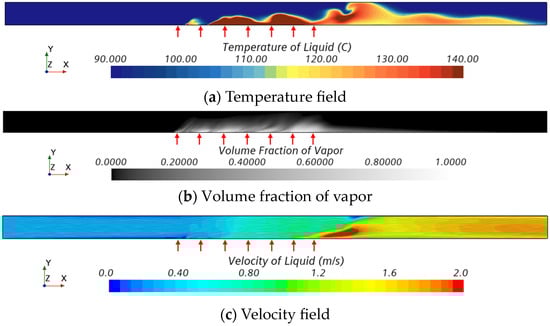 Figure 5 depicts the temperature field, vaporization rate, and velocity field for the most severe case among the five heat flux scenarios, specifically at 1350 kW/m2. It shows how thermal energy is transmitted to the internal fluid, leading to a temperature increase due to the heat flux supplied from the wall within the heating wall area. This process results in the formation of numerous bubbles adjacent to the wall. In the velocity field, one can observe a gradual increase in speed starting from the points where bubbles are formed, culminating in a sharp acceleration of velocity from the end of the heating wall onwards. This phenomenon seems to be attributed to the rising of the bubble clusters formed on the wall due to buoyancy.