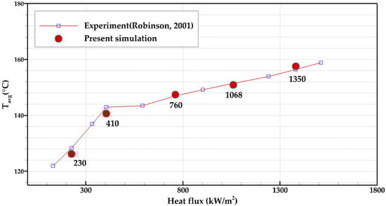 To ensure the accuracy of the wall boiling model, a validation simulation was conducted prior to simulating multiphase thermal flow in LH2 piping. Selected cases from experiments by Robinson [14], illustrated in Figure 3, served as the basis. In these experiments, a 10 × 10 × 50 (mm) heating block was placed 76 mm below a 16 × 10 × 241 (mm) horizontal channel. A mixture of water and antifreeze in a 50:50 ratio was introduced, allowing for variations in pressure and heat flux, and thus enabling the measurement of wall temperatures. Although Robinson’s experiments utilized antifreeze, making the conditions different from those in simulations of liquid hydrogen piping in this study, implementing these phenomena in numerical simulations from the perspective of phase-change mechanisms alone is expected to enhance the reliability of subsequent simulation results.