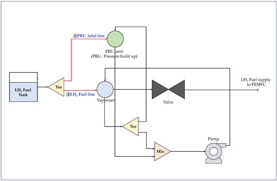 In this study, the FGSS for a hydrogen-propelled ship, targeted for analysis, comprises two lines within the liquid hydrogen piping, as illustrated in Figure 7. One line transports liquid hydrogen from the fuel tank to the Pressure Build Up (PBU) unit, referred to as the PBU inlet line. The other transports liquid hydrogen to the vaporizer, known as the LH2 fuel line. These two lines are the focus for the multiphase thermal flow simulation within the FGSS piping, assuming only liquid hydrogen is introduced. The piping design references the ASME and IGC codes, known for their cryogenic fluid piping design standards. While the overall process of this study mirrors the research conducted by Seo et al. [21], the differing pressures and temperatures of LH2 necessitate the re-selection of pipe diameter and thickness. Additionally, it aims to evaluate the safety of the piping under conditions of relatively higher pressure compared to those typically encountered in Cargo Handling System (CHS).