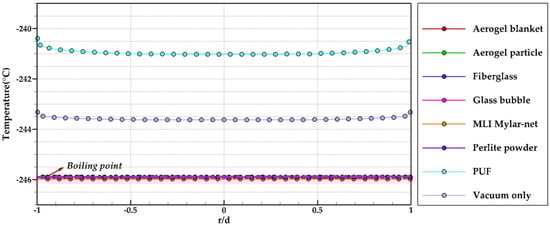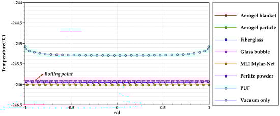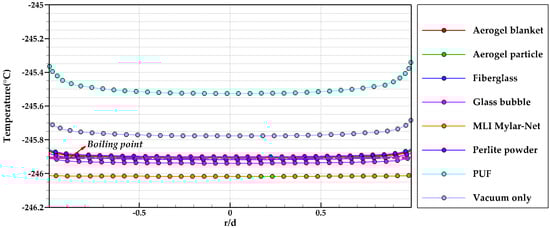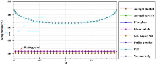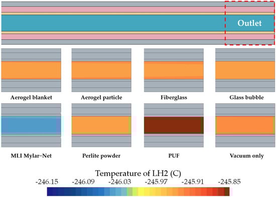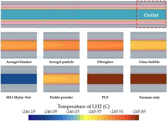 First, examining the results for Cases 1 and 2, corresponding to the PBU inlet line transporting liquid hydrogen from the fuel tank to the PBU, as shown in Figure 10, Figure 11, Figure 12 and Figure 13, it is evident that the type of insulation significantly affects the temperature distribution. Specifically, insulation materials with higher thermal conductivities result in higher temperatures. When using PUF or vacuum-only as the insulation material, it is inferred that the liquid hydrogen reaches temperatures above its boiling point (−246.03 °C), leading to vaporization. Conversely, aerogel blanket, aerogel particle, fiberglass, glass bubble, and perlite powder materials exhibit similar temperature distributions near the boiling point. On the other hand, the use of MLI Mylar net results in negligible temperature variations.