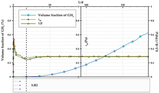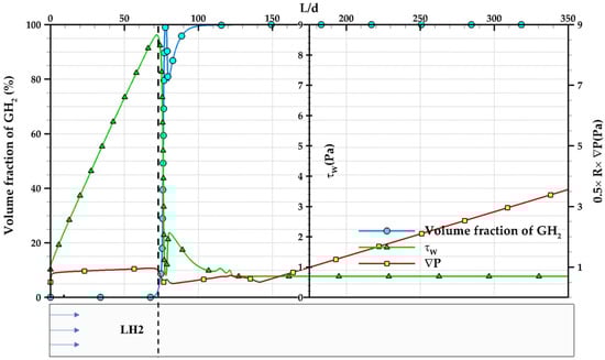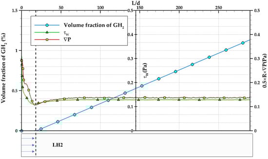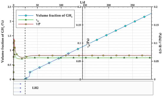 Figure 18, Figure 19, Figure 20 and Figure 21 depict the pressure gradient along the centerline, wall shear stress as determined by Equation (28), and the volume fraction of GH2 at the wall for the vacuum-only scenarios in Cases 1 to 4. These figures emphasize the effect of bubble generation on the internal flow dynamics, highlighting the significance of accurately identifying the ONB point—where bubbles begin forming in subcooled flow, as indicated by the black dotted lines. Identifying the ONB point, which marks the transition from single-phase to two-phase flow and significantly affects heat transfer and pressure drop in the piping, is crucial for evaluating thermal efficiency and safety [42].