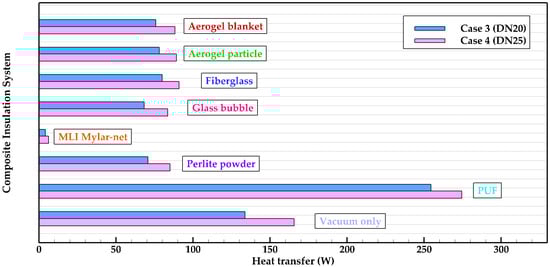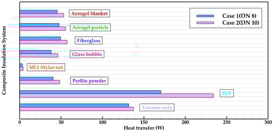 Figure 22 and Figure 23 showcase the comparison of heat transferred from the insulation to the inner wall for Cases 1 to 4, reflecting various insulation combinations. As indicated by the thermal conductivity values, the insulation performance ranks from best to least effective as follows: MLI Mylar net > glass bubble > perlite powder > fiberglass > aerogel particle > aerogel blanket > only vacuum. Additionally, in Cases 3 and 4, which feature larger diameters, an increase in the heat transfer area results in a higher amount of heat being transferred compared to Cases 1 and 2.