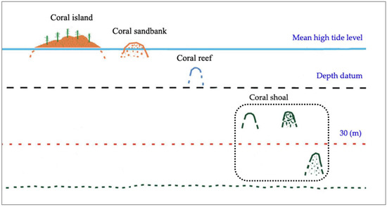 Coral islands and reefs are formed by the cementation of the remains of shallow water reef-building coral polyps and other reef-dwelling organisms in tropical oceans [1], which are an extraordinary type of ecosystem in the ocean, known as the “tropical rainforest in the ocean” and the “oasis in the blue desert” [2,3]. They have the highest biodiversity and primary productivity among all marine ecosystems, providing 2.85% of the value and services of the marine ecosystems with only 0.2% of the marine area [4]. Global coral islands and reefs are mainly distributed along the coasts of continents and islands in tropical oceans on both sides of the equator, with the Pacific, Indian, and Atlantic oceans accounting for 55%, 30%, and 15%, respectively [5,6]. At least 96 countries and regions worldwide benefit from coral islands and reefs tourism [7]. Coral islands and reefs can be divided into coral islands, coral sandbanks, coral reefs, and coral shoals. Coral islands and coral sandbanks are both located above the mean high tide level. Coral islands have dense vegetation and are well-developed. However, most coral sandbanks have no vegetation and are unstable. Coral reefs are located between the depth datum and the mean high tide level, exposed at low tide and submerged at high tide. Coral shoals are located below the depth datum and are not exposed even at low tide, and are sometimes distributed at water depths exceeding 30 m. The sketch map of coral islands and reefs is shown in Figure 1.