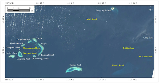 The Xisha Islands are located at the southeast of Hainan Island and the northwest of the vast South China Sea. Centered on Yongxing Island, the capital of Sansha City, they are about 330 km away from Yulin Port in Sanya City and Qinglan Port in Wenchang City. The geographical location of the Xisha Islands is between 15°42′~17°08′ N and 111°10′~112°54′ E, ranging from Bei Reef to Songtao Shoal in the north–south direction and from Xidu Shoal to Zhongjian Island in the east–west direction [1]. According to data records, there are eight independent coral shoals in the Xisha Islands, namely Yinlin Shoal, Xidu Shoal, Binmei Shoal, Beibianlang, Zhanhan Shoal, Songtao Shoal, Shanhudong Shoal, and Yongnan Shoal. The shallowest parts of Yinlin Shoal, Binmei Shoal, Beibianlang, Zhanhan Shoal, Shanhudong Shoal, and Yongnan Shoal have a water depth of over 10 m, while the water depth of Xidu Shoal and Songtao Shoal is above 20 m, with a maximum depth of over 200 m (Figure 2).