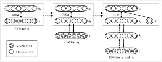 The DBN is a non-convolution model successfully applied in deep frame training, which can be interpreted as a Bayesian probability generation model [41,46]. It is composed of multi-layer random hidden variables. The upper two layers have an undirected symmetric connection, the lower layer obtains a top-down-directed connection from the upper layer, and the state of the lowest unit is the visible input data vector. The DBN is stacked by multiple Restricted Boltzmann Machines (RBMs) [55], as shown in Figure 3. The number of visible neurons in each RBM unit equals the number of hidden neurons in the previous RBM unit. According to the deep learning mechanism, the first layer of RBM units are trained by the input samples and their outputs are used to train the second layer of RBM units. The RBM units are stacked, and the performance of the model is improved by adding layers. In the unsupervised pre-training process, the DBN code is input to the top RBM unit, and then the state of the top unit is decoded to the bottom unit to realize the input reconstruction.