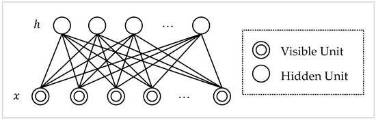 where , , and are the weight matrix to be trained, and and are the bias vectors to be trained in the visible layer and the hidden layer, respectively. The conditional probability distribution of visible unit and hidden unit is shown in Equations (4)–(6):