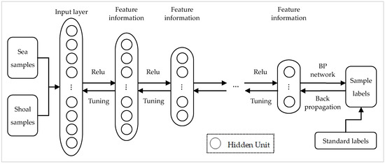 Training sample selection: the coral shoals samples and the sea samples are extracted by means of man–machine intersection to build a classification label sample set by combining the band information and the sample type information, which is used as the input of the DBN classification model.