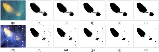 Enhanced images and their DBN classification and median filtering results of Yinli Shoal: (a,g,m) are enhanced images of Worldview-3, SPOT-6, and GF-1, and the images’ enhancement is to better visualize; (b,h,n) are DBN classification results; (c,i,o) are 3 × 3 window filtering results; (d,j,p) are 7 × 7 window filtering results; (e,k,q) are 15 × 15 window filtering results; and (f,l,r) are 27 × 27 window filtering results.