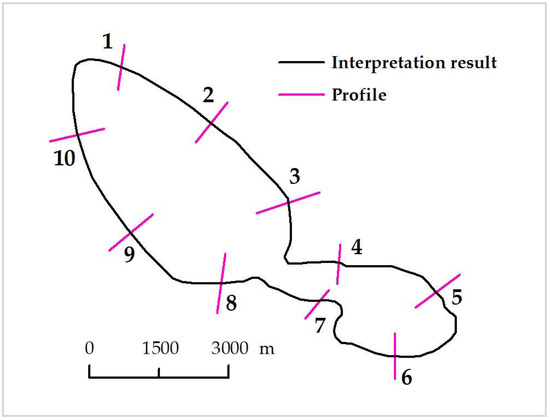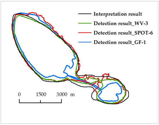 The interpretation result is divided into 10 equal parts randomly, and 10 profiles are made along the vertical direction of the interpretation result, whose distribution is shown in Figure 10. The distance between the interpretation and detection results on the profile are calculated respectively, and their absolute values are used to evaluate the accuracy of the detection results, as shown in Table 2. It can be seen that the accuracy of the detection results is closely related to the spatial resolution and image quality of the remote sensing images. For the Worldview-3 image, the edge of the Yinli Shoal is well detected. Except for the area between the northwest and southeast, which is quite different from the interpretation results, there is a small area missing in the southeast. For the SPOT-6 image, a greater level of detection exists on the northeast side of the northwest part, and it is found that there are easily mixed image features in this area. The detection result of the GF-1 WFV image shows that its effect is poor, and the edge is relatively coarse, especially in the area between the two parts. There may be two reasons: first, because of the low spatial resolution of the GF-1 WFV image, the image characteristics of the shoal are not obvious; second, because of the large amount of clouds in the image, the shoal details are filtered out in the median filtering in order to suppress most of the clouds.