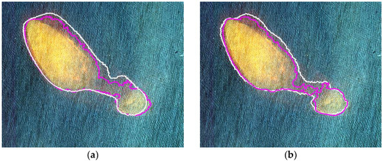 Detection results of Yinli Shoal based on SPOT-6 image: (a) 7 × 7 window and (b) 15 × 15 window. The pink solid line is obtained based on the multi-spectral image, and the white solid line is obtained based on the fusion image.