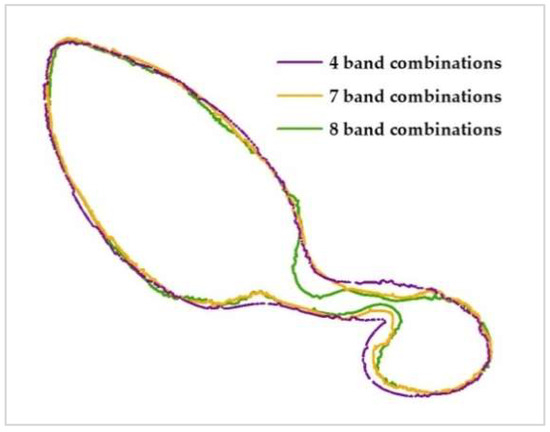 In addition, based on the Worldview-3 image of the Yinli Shoal, this study compares the difference in the detection results using all eight band combinations with only using traditional four-band combinations (Blue B2, Green B3, Red B5, and Near Infrared B7) and using seven-band combinations, excluding the coastal blue band (B1). The 7 × 7 window is used for median filtering, and the same training sample data are used in the three combinations. The detection results are shown in Figure 14. In general, there is little difference in the detection results based on the three combinations. Since the Worldview-3 image has only eight bands, it is not clear how the spectral resolution of the remote sensing images affects the detection results of the coral shoals, so it is necessary to use the hyper-spectral image for further analysis.
