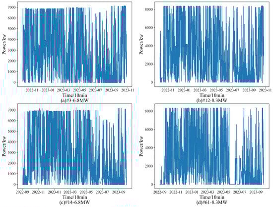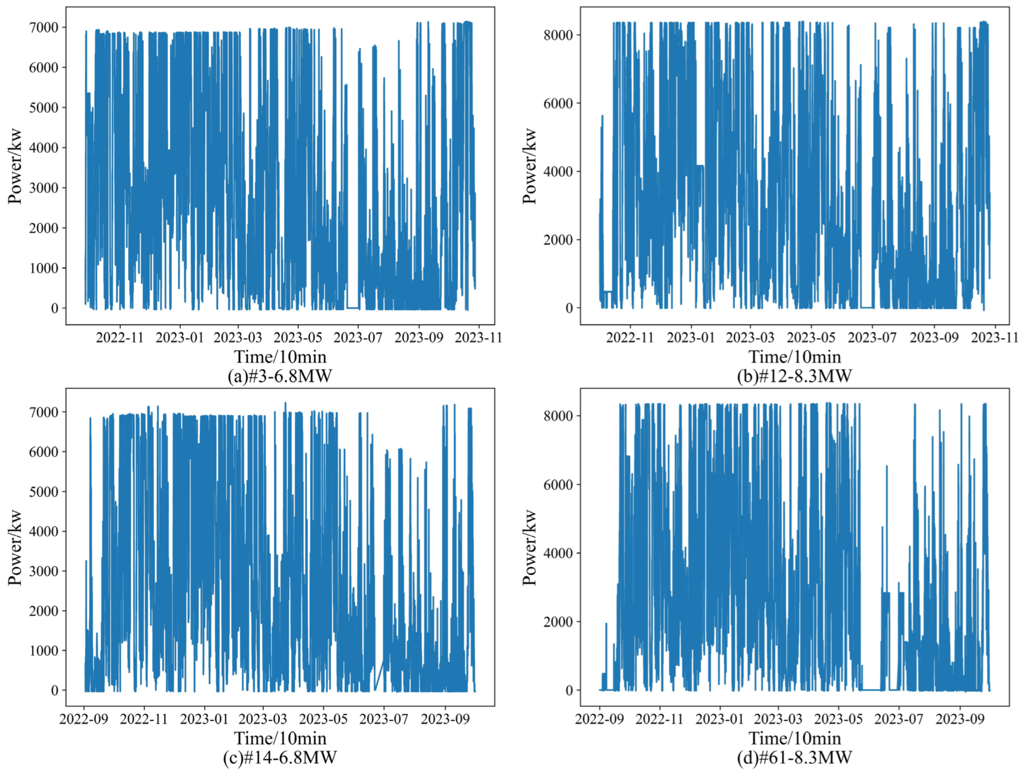 This study scrutinized acquired data from wind turbines located at an offshore wind farm in Guangdong. The wind farm, situated roughly 55 km off the coast in waters 41–46 m deep, has a total installed capacity of 500 MW. It consists of 37 wind turbines, each with a capacity of 6.8 MW, and 30 turbines of 8.3 MW. The facility also includes a 220 kV offshore booster station and 35 kV underwater transmission cables. We randomly selected historical data from four units within the wind farm, two of which were 6.8 MW and the other two 8.3 MW. This historical dataset comprises measured output power gleaned from the SCADA and NWP systems. All the data maintained a time resolution of 10 min, accruing to 144 data samples per day. Each unit’s data spanned one year and one month. We used the first year’s data for both training and validation purposes, while the subsequent month’s data served to test the model’s precision. Table 1 and Figure 1 provide a detailed overview of the raw power data for the four wind turbines under consideration.