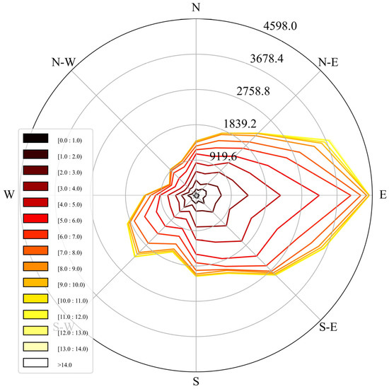 When the wind direction is stable, the impeller of the wind turbine can be maintained at the optimal angle, allowing the wind energy to be more fully utilized, at which point the wind turbine generates more power and is more efficient. In contrast, when the wind direction varies significantly, the impeller of the wind turbine needs to constantly adjust its angle to adapt to different wind directions, which will affect the efficiency and power generation of the generator. Although advanced offshore wind turbines are now equipped with an automatic yaw-to-wind system, which can automatically adjust the nacelle’s direction and track the incoming direction of the wind in real time, the system also requires a specific reaction time, and inevitably, there will be wind alignment errors. The wind direction time-series feature data are conducive to the deep learning model capturing the wind-pairing error distribution law of the wind turbine to eliminate this error. Meanwhile, the wind direction and wind speed have a close relationship, as shown in Figure 3, and historical wind speed direction rose diagram of a wind farm, from which the distribution of wind speed values at different wind speed intervals in each direction shows a high degree of similarity. The scale of the wind speed distribution is given in counts within the 13 months, and the color scale of the wind speed contours is in m/s. For the same wind farm, the terrain and geomorphological features in each direction were specific and greatly influenced the change in wind speed. Therefore, the wind direction time-series feature data are also conducive to the model to better capture the change rule of wind speed and improve the accuracy of the wind power prediction results.