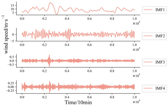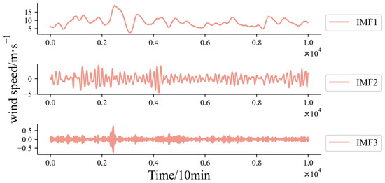 Taking the data of Unit 12 as an example, the parameters of the decomposition process are shown in Table 3, and the correlation coefficient nearly reaches the maximum value when the value of k is 3. With further increase of k, the RMSE decreases, but the decrease is slow, while the correlation coefficient remains relatively stable. The computation time will greatly increase as the number of decomposition layers increases. The larger the number of decomposition layers k, the better the signal overlap before and after reconstruction. However, as the value of k increases, the reconstructed signal is prone to introducing noise. As shown in Figure 4 and Figure 5, the VMD 4-layer decomposition introduces noise with a small amplitude on top of the VMD 3-layer decomposition, which instead tends to confuse the timing features. Therefore, the optimal number of decomposition layers chosen , and each component is shown in Figure 4. Among them, IMF1 reflects the overall trend of the original wind speed signal and is the trend component; IMF2 is the main fluctuation component of the wind speed signal; IMF3 is the secondary fluctuation component of the wind speed signal.