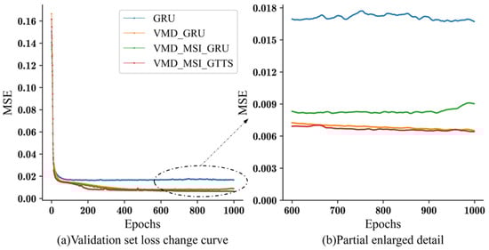 The network parameters are updated by backpropagation gradient descent, the optimizer is Adam, the learning rate is set to 0.0001, the loss function is MSE, and the current optimal model is automatically saved when the loss function values of both the training set and the validation set reach the minimum. The number of iterations is set to 1000. Taking the data of Unit 12 as an example, the loss function curves of each model’s training set and validation set are shown in Figure 10 and Figure 11.