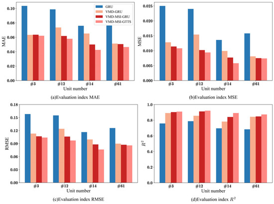 From Figure 12, it can be intuitively seen that the VMD-MSI-GTTS model proposed in this paper achieves the best evaluation indexes in the power forecast experiments of all four units. Compared with the three methods of GRU, VMD-GRU, and VMD-MSI-GRU, the VMD-MSI-GTTS model has the smallest MAE, MSE, and RMSE for the power forecast results of the four units, and the value of the coefficient of determination R2 is the closest to 1. It can be derived from Table 4.