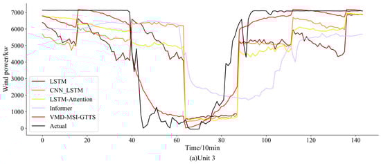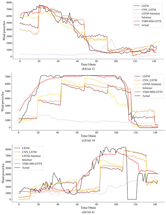 To further validate the proposed VMD-MSI-GTTS model in the offshore wind turbine power forecasting problem with LSTM [39], CNN-LSTM [40], LSTM-Attention [41], and Informer [42,43] models for comparison experiments. The results of the comparison experiments are shown in Table 6, and the visualization results are shown in Figure 15. From Figure 15, it can be visualized that the VMD-MSI-GTTS model proposed in this paper exhibits excellent forecast performance on all four WTGs, significantly outperforming the other four compared models. Specifically, the VMD-MSI-GTTS model achieved the best evaluation metrics on all datasets. In contrast, the other models had their strengths and weaknesses in performance on the different unit datasets. For example, in the dataset of Unit 3, the Informer model achieved the smallest values for MAE, MSE, and RMSE metrics; however, in the dataset of Unit 61, the Informer model had the highest MAE, MSE, and RMSE values of the four compared models.