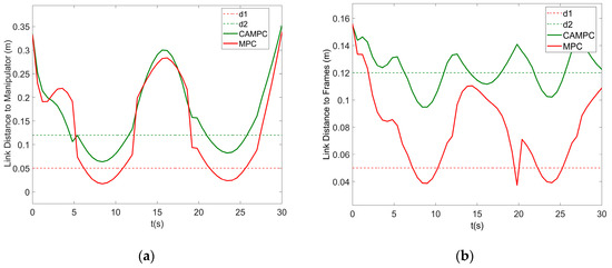 Comparison of the minimum distances of certain links: (a) The fluctuation of the minimum distance from link 5 of the right manipulator to the left manipulator; (b) The fluctuation of the minimum distance from link 3 of the right manipulator to corresponding frames.