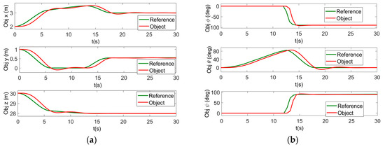 States of positions are shown in Figure 11 and Figure 12. The poses and Euler angles in Figure 11 record both trajectories (traveling from the start point to the endpoint through several waypoints and being stable finally) of the object and the reference. In this case, the pitch and roll angles of the vehicle are controlled to zero. The pose of the vehicle is in Figure 12 and Figure 13 provides the joint angles of the manipulators. It should be noted that both manipulators have the same joint angles because their end effectors are fixed with the objective, which reduces the degrees of freedom.