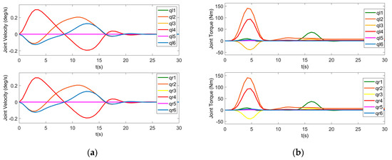 Joint velocities and manipulators input: (a) Joint angular velocities of both manipulators; (b) Torques of the manipulators.