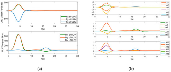 UUV torques input and compensation signals from the neural network: (a) Torques of the UUV; (b) NN compensation signals.