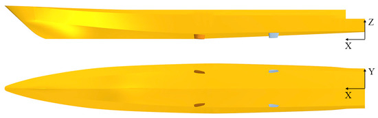 A semi-displacement ship with a typical V-shaped bow and transom stern equipped with two pairs of fin stabilisers was simulated. Designed to cruise at 18 knots, the corresponding Froude number of the ship was Fr = 0.4. Figure 1 displays the geometric configuration and coordinate system of the vessel. Table 1 outlines the primary model parameters with a scale ratio of 1:16.