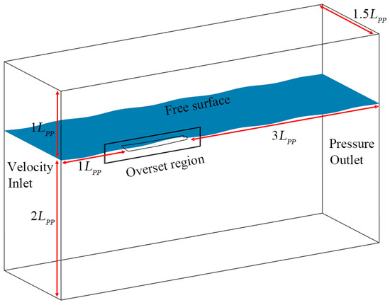 Numerical solutions were applied to a half-side ship model owing to its symmetry. The wave motion of the ship was simulated using overset mesh technology, permitting heave and pitch motions. The computational domain was bifurcated into the background and overset regions. Given the wave-damping function at the outlet, the distance from the stern to the outlet exceeded the computational domain used for calm water resistance simulation. Figure 3 shows the length, width, and height of the background region as: −3 < X/LPP < 2, 0 < Y/LPP < 1, −2 < Z/LPP < 1. The overset region was slightly larger than the hull, with length, width, and height dimensions of 1.5 LPP, 0.15 LPP, and 0.3 LPP, respectively.