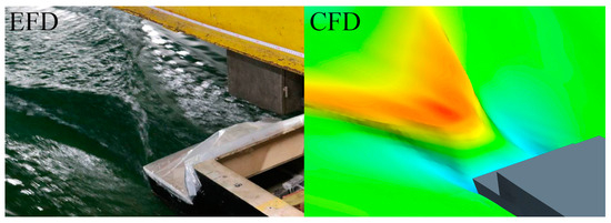 Research on SF and interceptors can be divided into two. The first is stern appendage mechanism analysis based on simplified modelling. Brizzolara [4] and Brizzolara and Salian [5] numerically solved the flow field around a two-dimensional interceptor using a computational fluid dynamics (CFD) solver. The velocity and pressure distributions and other flow field information in the interceptor installation area were analysed to summarise the hydrodynamic mechanism of the interceptor. Deng et al. [6] studied the interceptor mechanism by simplifying the three-dimensional hull into a two-dimensional flat plate and investigating flow details such as velocity, pressure, and vorticity fields under interceptors of different heights. Using Reynolds-averaged Navier–Stokes (RANS) equations, Mansoori et al. [7] simulated the flow field around a fixed plate with an interceptor at different heights and angles of attack and compared the numerical results with the experimental data, demonstrating that the thickness of the boundary layer varies by speed, thereby affecting the efficiency of the interceptor. Jacobi et al. [8] employed particle image velocimetry (PIV) to measure the velocity field in the stern area before and after interceptor installation and reconstructed the pressure load to analyse the blocked flow and high-pressure peak caused by the installation. They reconstructed the three-dimensional flow field by scanning PIV flow field information at multiple sections and analysing the measurement uncertainty and lift change caused by the interceptor.