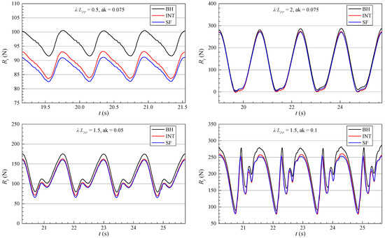 Figure 6 illustrates the resistance fluctuation of the half ship over time under various wave conditions before and after stern appendage installation, revealing that ship resistance in regular waves manifests a pronounced nonlinear characteristic. The installation of the interceptor and SF reduces the resistance, with the extent of this reduction being closely linked to the wavelength and steepness.