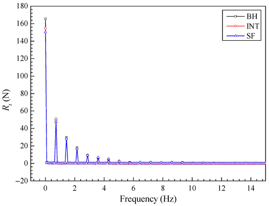Figure 7 illustrates the FFT ship resistance outcomes when subjected to wave conditions λ/LPP = 1.5, ak = 0.075, revealing prominent resistance amplitudes at positions from the zeroth (0 Hz), first (0.718 Hz, fe), second (1.436 Hz, 2 fe), third (2.154 Hz, 3 fe), up to the sixth order (4.308 Hz, 6 fe). The zeroth-order amplitude dominates, with subsequent-order amplitudes diminishing progressively. A noticeable decline is observed in the resistance amplitude across all orders post-installation of the interceptor and SF, particularly the 0th order.