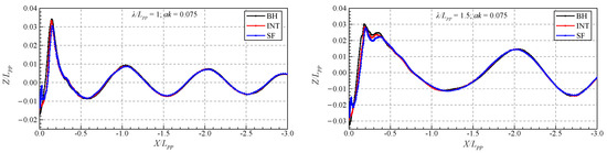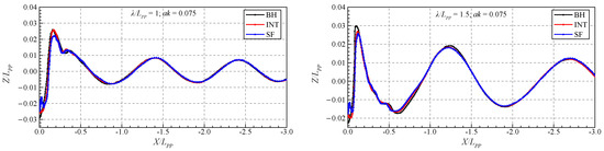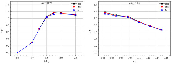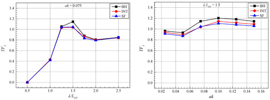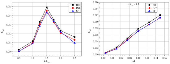 We applied Equation (12) with the 0th-order amplitude resistance coefficient to calculate the wave-added resistance under diverse wave conditions (Figure 8). It is observed that, for ak = 0.075, the added resistance coefficient first increases and then diminishes as the wavelength increases. At λ/LPP = 1.5, the added resistance percentage peaks at 70.6%. At wavelength 1.5 LPP, the added resistance coefficient climbs with wave steepness growth. The introduction of either an interceptor or SF consistently reduces the added resistance coefficient below the bare hull’s coefficient to a degree dependent on both the wavelength and steepness.