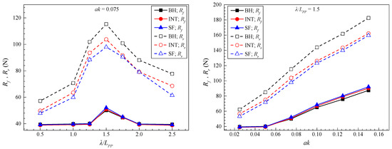 Figure 10 shows that the residual resistance (Rr) and frictional resistance (Rf) initially decrease and then increase with wavelength. The resistance reduction rate at the corresponding wavelength in Figure 9 is relatively high, owing to the low resistance of ships at small and large wavelengths. The numerically derived half-ship resistance components under various wave conditions reveal that adding both appendages significantly trims the residual resistance of the ship; however, it slightly influences the frictional resistance. With ak ≥ 0.075, the frictional resistance increased by only <5%. This dynamic explains why the resistance reduction rates of both stern appendages diminish as wave steepness increases. At λ/LPP = 1.5, ak = 0.075, both frictional and residual resistances increased compared to other conditions, largely owing to green water occurrences on the ship deck.