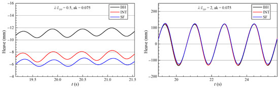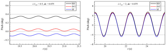 Figure 11 and Figure 12 present the time-domain outcomes for ship heave and pitch under typical wave conditions. Both motion responses display prominent linear characteristics, and the motion amplitude increases with increasing wavelength. Introducing the interceptor and SF reduces the average values for heave and pitch across diverse wave conditions.