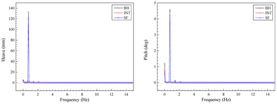 FFT was then applied to deduce the first-order heave and pitch pulsation amplitudes under corresponding wave conditions. Figure 13 displays the corresponding results at λ/LPP = 1.5, ak = 0.075 as an example. The heave and pitch exhibit pronounced amplitudes at the zeroth-, first-, and second-order (0; 0.718, fe; and 1.436 Hz, 2 fe, respectively) positions. However, the predominant amplitude was in the first order. For interceptor and SF post-installation, the zeroth-order amplitude for both heave and pitch reduced noticeably; although the first-order heave amplitude also declined, the pitch amplitude remained relatively unchanged.