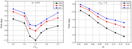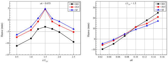 Figure 14 and Figure 15 depict the relationship between the mean heave and pitch values against wavelength and wave steepness, respectively, highlighting an explanatory correlation between the previously discussed-added resistance scenario. Within the λ/LPP = 0.5–2.5 range, the pitch value peaks at λ/LPP = 1.5, concurrent with the highest added resistance. For λ/LPP = 1.5, adding the appendages reduces the pitch across all wave steepness levels and diminishes the heave in the ak = 0.025–0.075 range. For ak ≥ 0.1, the ship exhibited a positive average heave, leading to an overall reduction in its draft. Therefore, adding either appendage slightly increases the draft (see Figure 10) with a rise in frictional resistance and a decline in the resistance reduction rate shown in Figure 9. Furthermore, the enhanced ship motion amplitude under wave conditions enabled the stern appendages to exert more influence on the posture of the ship under wave conditions.