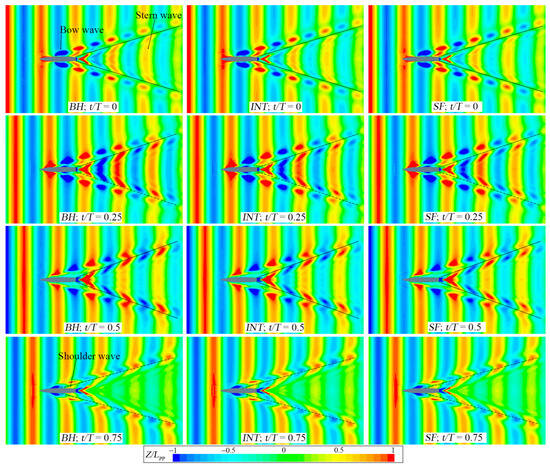 We then analysed variations in the flow field around the ship pre- and post-installation of the stern appendages. Figure 18 shows that the free surface waveform is an amalgamation of a head sea-regular wave and the Kelvin wave system. At t/T = 0, the crest of the wave approached the bow of the ship, causing the ship to pitch forward and inducing an enhanced bow wave break. At t/T = 0.5, the trough of the wave met the bow of the ship, causing an enhanced trim by the stern. Over time, the angle of the stern wave system increased incrementally towards that of the bow wave system. By t/T = 0.75, a shoulder wave system emerged. For post-installation of the interceptor or stern flap, the posture alterations of the ship impacted the amplitudes of different wave systems. Notably, the amplitude of the stern wave system diminished, particularly the wave height in the near-stern flow region, such as the rooster tail flow.