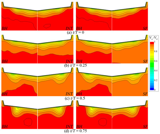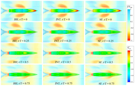 Figure 21 depicts the ship’s axial velocity distribution at the cross-section X/LPP = 0.216 (flow capture section of the waterjet propulsion ship) across an encounter period. Prominent, periodic fluctuations in the pitch and heave within waves caused the nominal wake field to vary considerably over time. For the post-installation of the interceptor and SF, the boundary layer thickness expanded. That is, the inflow velocity of the ship diminished. The impact of the SF on the velocity of the nominal wake field surpassed that of the interceptor.
