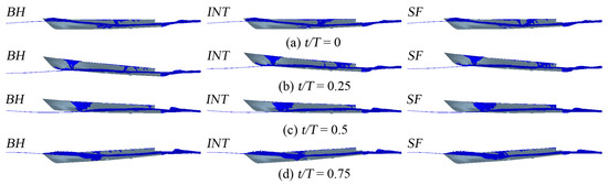 Figure 23 illustrates the green water phenomenon [35,36] on a ship’s deck at λ/LPP = 1.5, ak = 0.075 throughout an encounter period, distinctly portraying green water presence on the deck at varying times. This observation elucidates the pronounced nonlinearity in the resistance of the ship and the particularly evident added resistance under this wave condition, as previously discussed. Nevertheless, the presence of green water does not significantly influence the ship’s motion response, which remains almost consistent across other wave conditions. Additionally, integrating the stern appendages does not induce noticeable changes in the green water phenomenon on the deck.