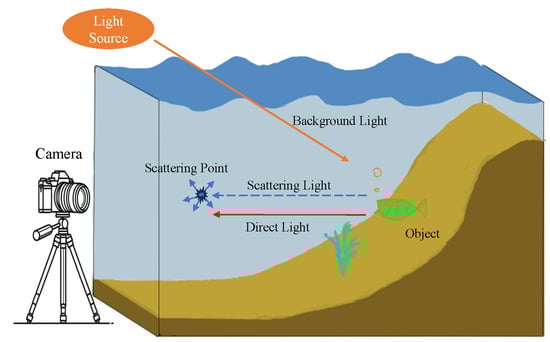 Figure 2 depicts the underwater image formation model, where the camera captures underwater image information comprising attenuated direct signals and scattered signals from the water body. The imaging model is represented as follows: