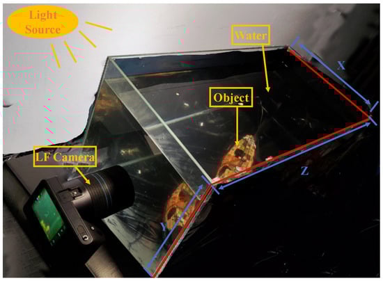 In this study, we conducted experiments in a dark environment using a water tank with dimensions of 0.7 × 0.4 × 0.4 m. All sides of the tank, except the shooting face, were covered with opaque black film to prevent external light reflections. We used white LED lights as the light source. The Lytro Illum camera was positioned 2 cm away from the tank. Figure 3 illustrates this experimental setup. Note that the selection of the tank size was based on the physical space constraints of the laboratory and the practical feasibility of operations. Ideally, a larger water tank would better simulate the light propagation paths in real environments. However, due to the limitations of our laboratory conditions, we could only use the available size of the water tank for our experiments.